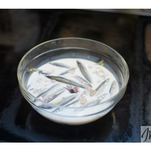 1. Порезать кальмары на кольца толщиной 1,25 см. Замочить на 20 минут кальмары и маленькую рыбку (на ваш выбор) в достаточном количестве молока.