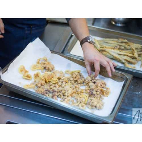 2. Большую тяжелую кастрюлю (или фритюр) наполовину заполнить маслом и разогреть до 175°С. В это время просеять 2 чашки муки в большую мелкую миску. Просушить кальмары и маленькую рыбку, приправить их солью и перцем. Также приправить нут, лук-шалот и слайсы лимона.