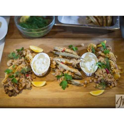 Жареные кальмары и сардина с хрустящим нутом и лимоном: