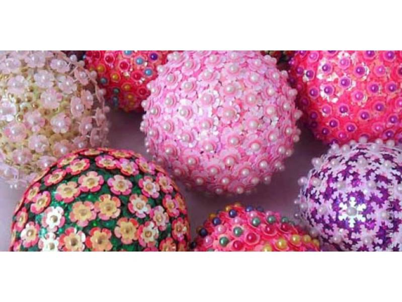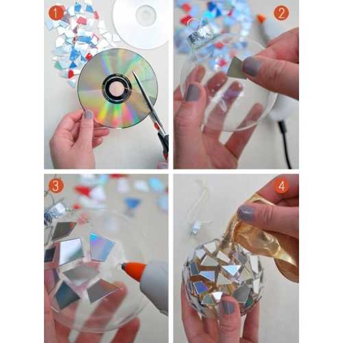 Для этого вида новогоднего декора лучше всего подойдут пенопластовые или пенополистирольные шарики. Мозаику из дисков приклеивают на жидкие гвозди. Если использовать пайетки, не менее сверкающие элементы из пластика, то можно их не приклеивать, а прикалывать булавками с декоративными шариками. При помощи пайеток можно создавать цветные рисунки любой сложности.