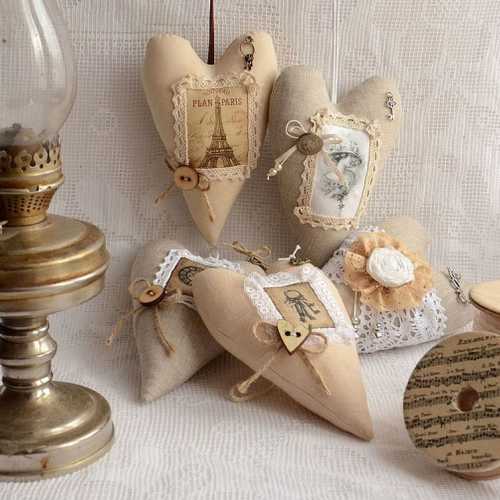 Своими руками могут быть сшиты из ткани маленькие подушечки на елку или можно их сделать из фетра. Или просто наклейте винтажные кружева на пластиковые шарики. Атрибутами винтажных изделий являются натуральные ткани, старинные фотографии.