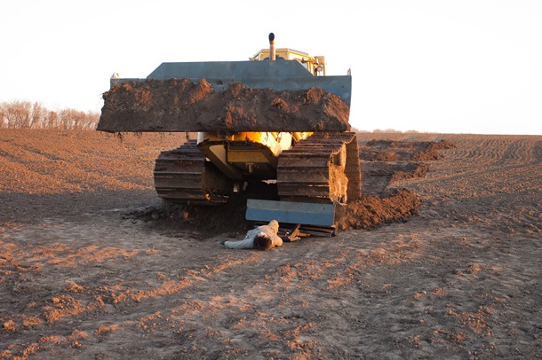 На невспаханном черном поле стоит пианино Украина. По клавишам летают пальцы музыканта, а голос выводит: “Мы будем вместе до последней выцветшей страницы”. Но кружащий по полю неуправляемый бульдозер сметает инструмент, перемалывая его в щепки. Музыка обрывается.