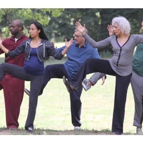 Звезды как раз снимали сцену, в которой они вместе с другими актерами отрабатывают приемы китайского боевого искусства тай чи.