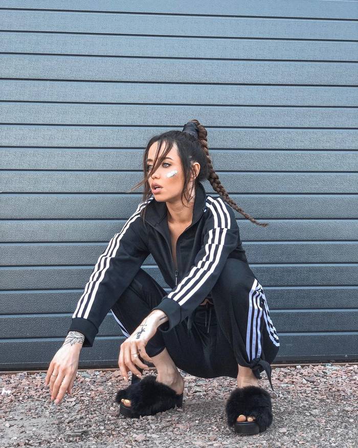 29-летняя знаменитость позирует в черном спортивном костюме Adidas, летних тапочках с мехом и сидя на корточках. Выразительный макияж с акцентом на глаза и высокая прическа с косичкой дополнили образ.