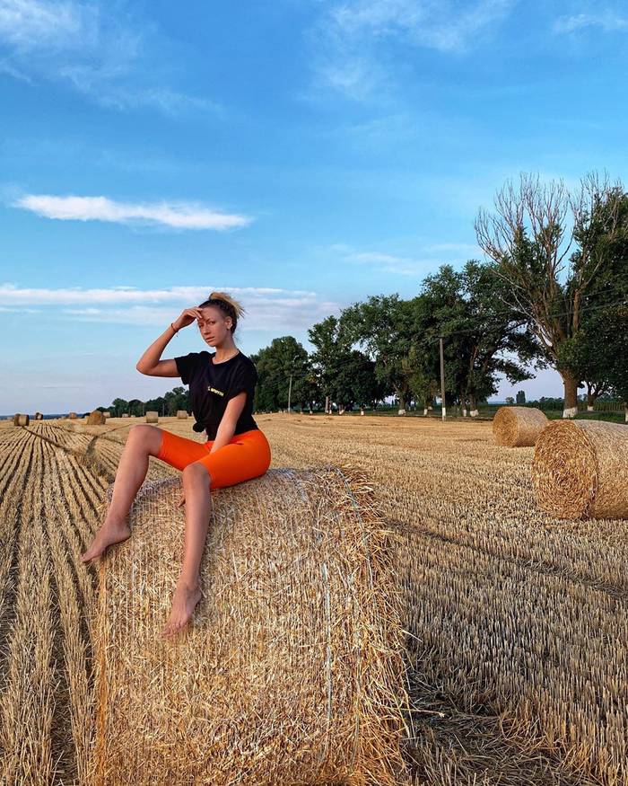 В кадре ведущая забралась на огромный тюк соломы, приняв чувственную позу. Леся позирует в черной футболке и ярко-оранжевых велосипедках, которые подчеркивают ее стройные ноги.