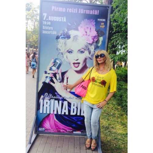 По городу Билык в стильном образе: рваных джинсах и ярко желтой футболке с алыми розами и надписью на английском "Я не даю интервью". Прадва, несмотря на угрожающую надпись, Ирина все же общалась с прессой.