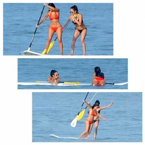 Круг интересов Ким Кардашьян давно известен: модные тусовки, съемки на тв, семья, шоппинг...А недавно Ким решила попробовать себя в новой роли серфера. Вместе с подругой звезда отправилась покорять океан. Видимо, девушки впервые пробовали стать на доску, потому что их робкие попытки "устоять" на серфе закончились ленивым болтанием в воде. Тем не менее, настроение подруг было отличным.