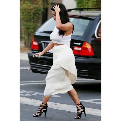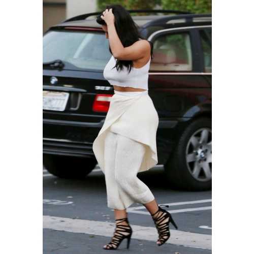 На этом трансформации Ким Кардашьян не завершились, дополнила она свой образ укороченным обтягивающим белым топом и босоножками на высоком каблуке.
