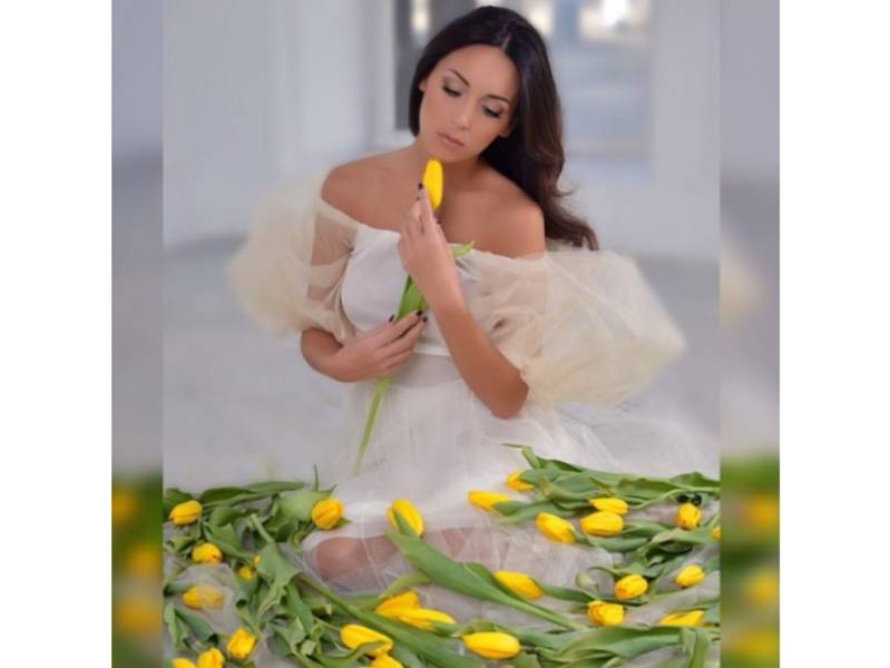 На снимке певица сидит в россыпи желтых тюльпанов, а один цветок держит нежно в руках.