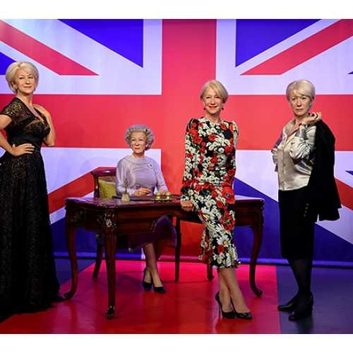 На фоне флага Великобритании расположились восковая Хелен Миррен в образе Королевы Елизаветы (за исполнение этой роли в фильме Королева актриса была удостоена Оскара), она же в образе Джейн Теннисон из сериала Главный подозреваемый и знаменитый образ Миррен с красной ковровой дорожки церемонии National Movie Awards.