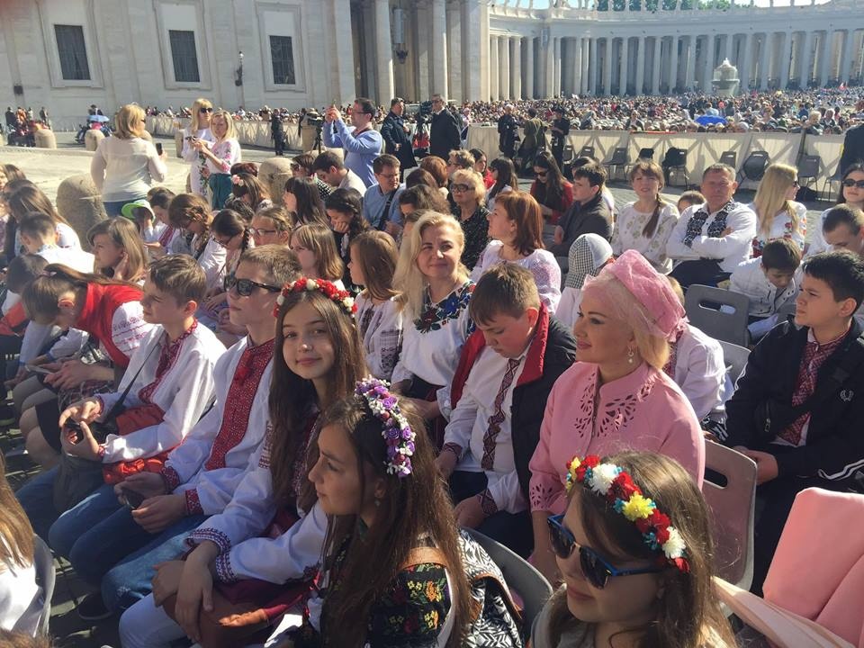 В качестве послов мира в Ватикан отправились и юные украинцы с Донбасса, которые накануне приняли участие в конкурсе песни Кати Бужинской и вместе с другими участниками написали на символических голубях пожелания мира, разместив их на созданной детьми карте.