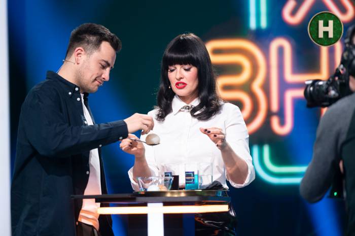 Капітан команди Фіма Константиновський і його тіммейтка, фехтувальниця Ольга Харлан відповіли, що це може бути кока-кола. Але помилилися! Ведуча «Хто знає?» Даша Астафʼєва показала, як діють ці рідини на курячі яйця.